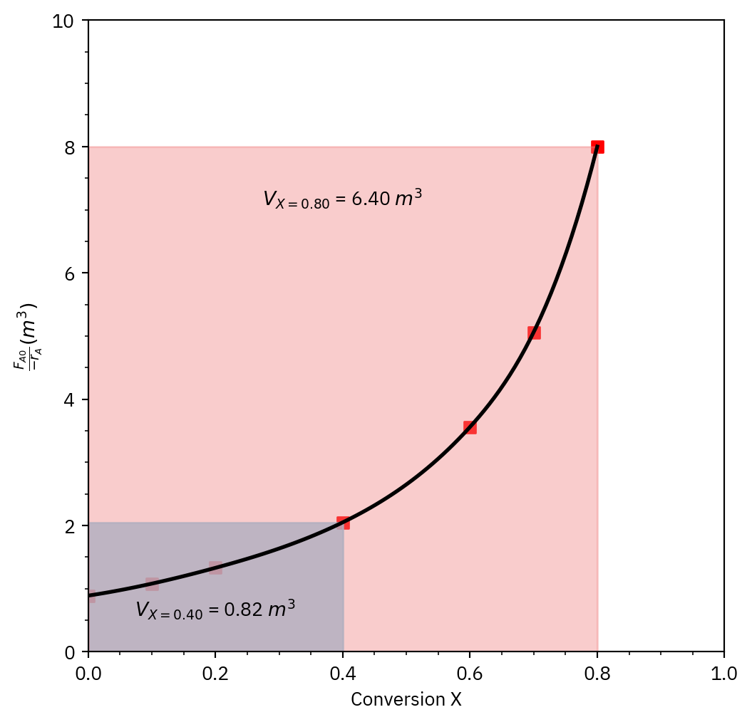 | PFR | dVdFA=rA | V=∫FA0FArAdFA | |