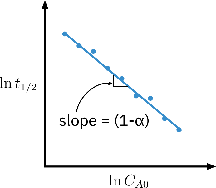 The plot of lnt1/2 vs. lnCA0 is linear with a slope of (1−α)