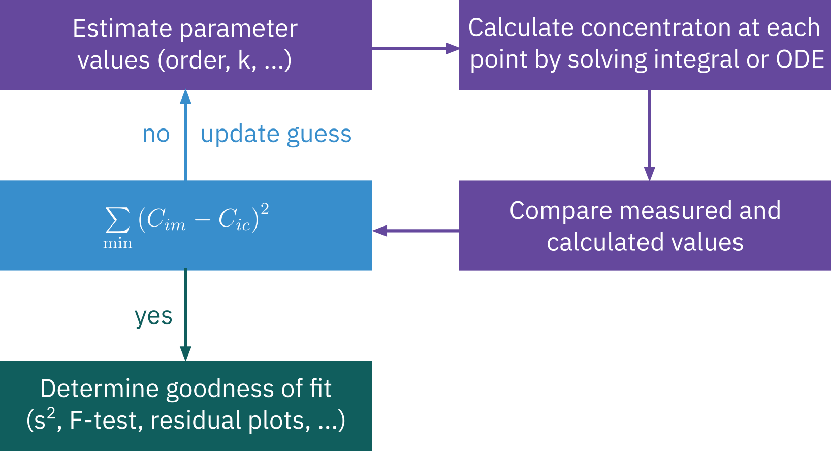 Search for parameter values that minimize the sum of squares of the difference between the measured values and calculated values for all data points.