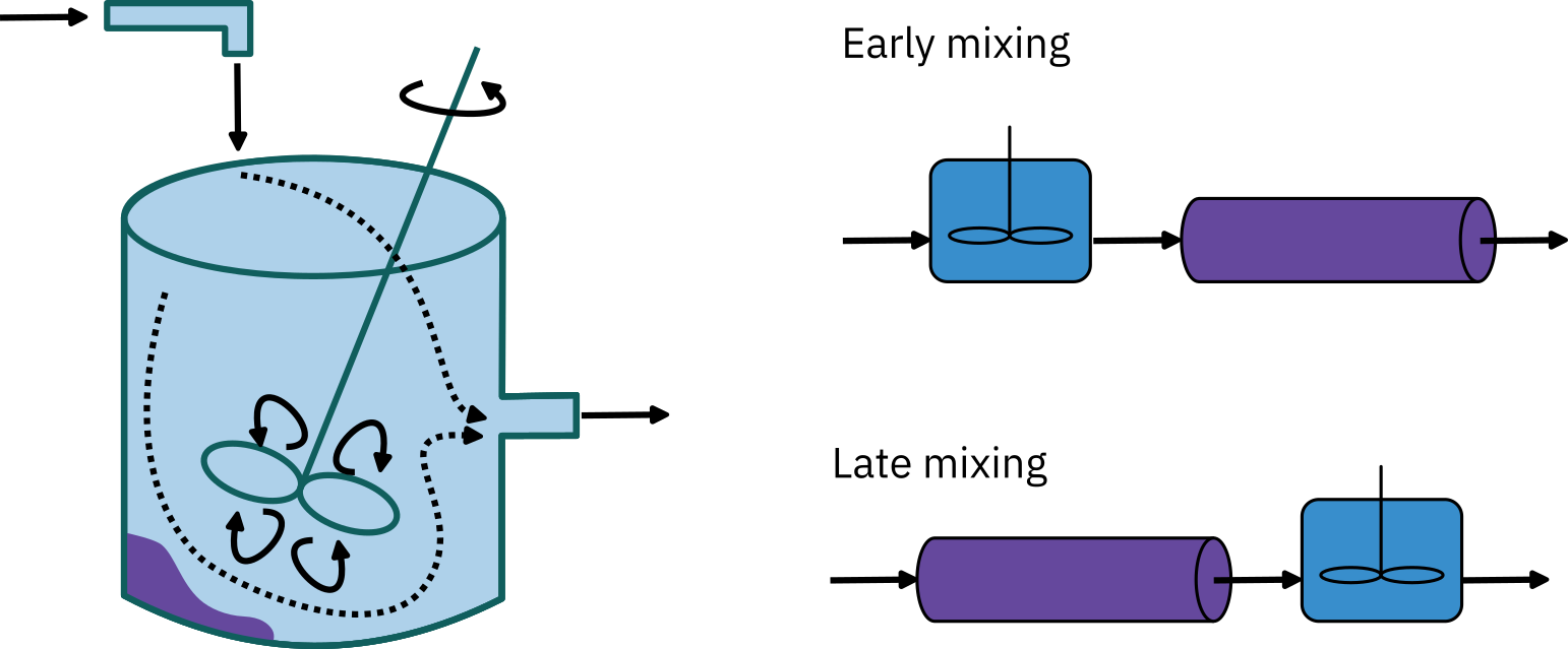 Depending on the location of the inlet and outlet, the reacting mixture may follow a tortuous path either before entering or after leaving the perfectly mixed zone → PFR