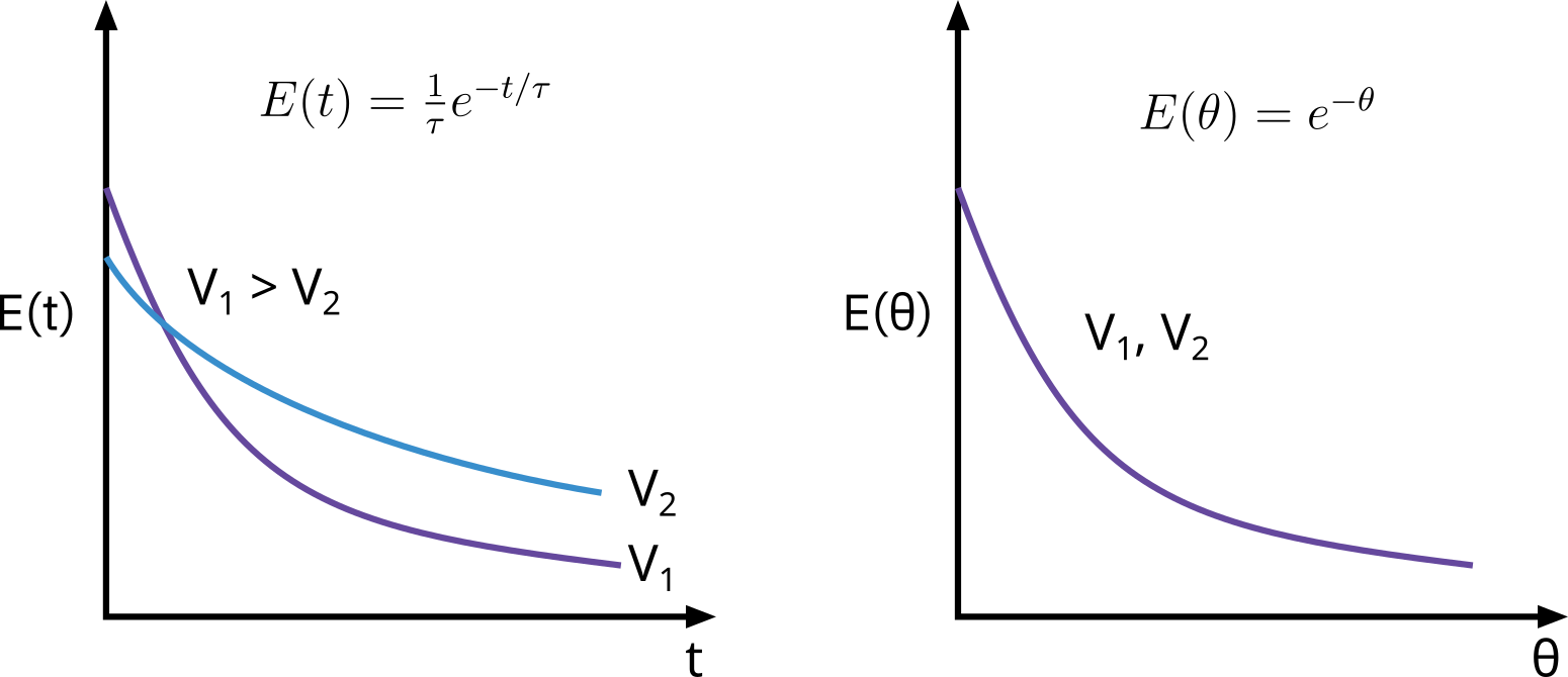 E(θ)=e−θwhereθ=τt;E(θ)=τE(t)